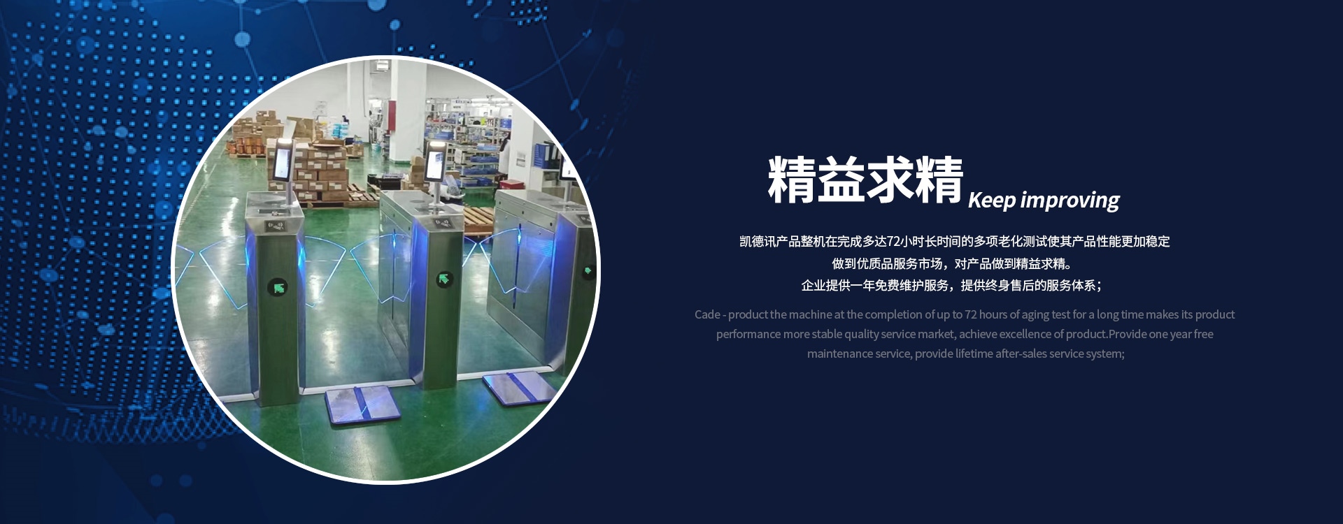 深圳市凱德訊科技有限公司成立于2003年,注冊(cè)資本500萬(wàn)元,位于港珠澳大灣區(qū)的深圳市,公司集研發(fā)、生產(chǎn)、銷(xiāo)售電子行業(yè)防靜電門(mén)禁系統(tǒng)和民用智能通道系統(tǒng)的綜合性企業(yè)。公司擁有自主產(chǎn)權(quán)的產(chǎn)品并一直致力于ESD門(mén)禁系統(tǒng)、智能安防門(mén)禁系統(tǒng)、景區(qū)通道閘機(jī)、人臉識(shí)別閘機(jī)、消費(fèi)系統(tǒng)、智能翼閘的研發(fā)生產(chǎn)與銷(xiāo)售。凱德訊目前擁有多款功能齊全的系統(tǒng)軟件及多款硬件產(chǎn)品,包含成型加工、機(jī)芯研發(fā)、軟件開(kāi)發(fā)等技術(shù)均為本公司自主研發(fā)、獨(dú)立完成。14年來(lái),凱德訊一直秉承以用戶需求為核心,穩(wěn)定、實(shí)用、智能的產(chǎn)品是我們開(kāi)拓市場(chǎng)的基石,務(wù)實(shí)進(jìn)取的精神是我們孜孜不倦的追求,全方位真誠(chéng)的服務(wù)是我們對(duì)您永恒的承諾。